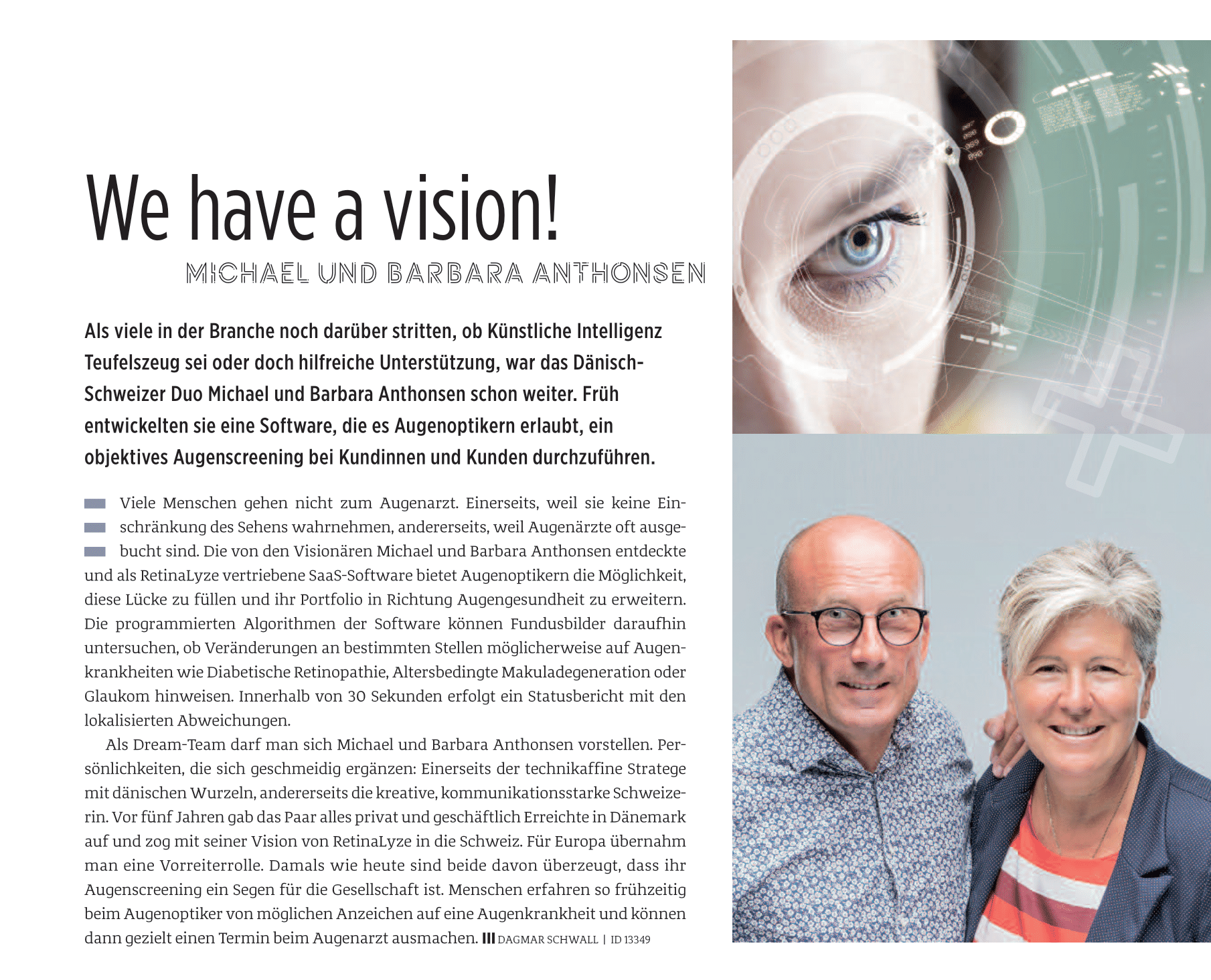 Hinter RetinaLyze D-A-CH stehen zwei ganz unterschiedliche Persönlichkeiten: Einerseits treffen Sie auf den technikaffinen Strategen mit dänischen Wurzeln und andererseits auf die kreative, kommunikationsstarke Schweizerin. Ein Paar, das im Jahr 2015 alles privat und geschäftlich Erreichte in Dänemark aufgab. Michael und Barbara Anthonsen reisten mit einer Vision in die Schweiz. Sie entschieden damals, das Konzept von RetinaLyze ®